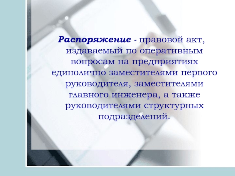 Слайд 15 Распоряжение - правовой акт, издаваемый по оперативным вопросам на предприятиях