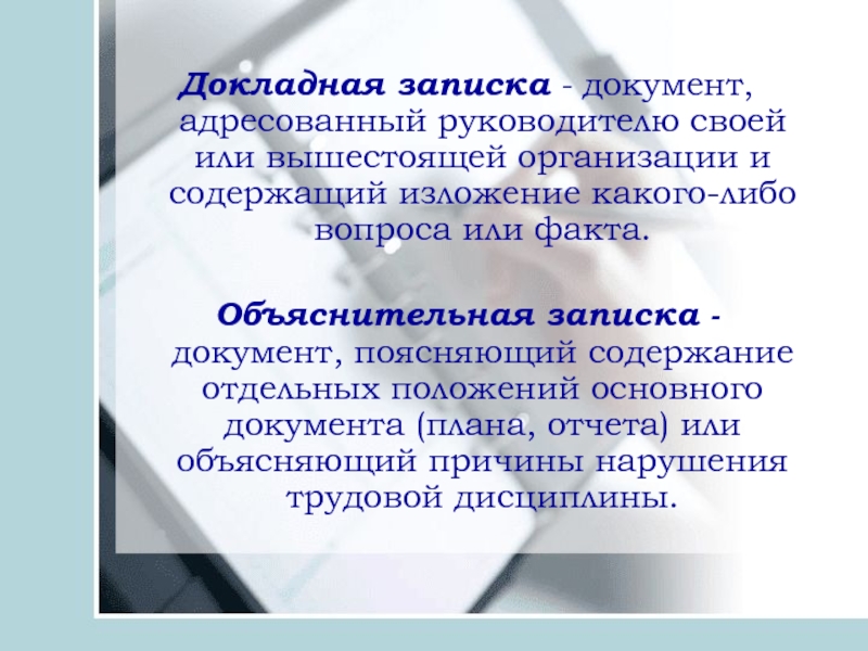 Слайд 20Докладная записка - документ, адресованный руководителю своей или вышестоящей организации и