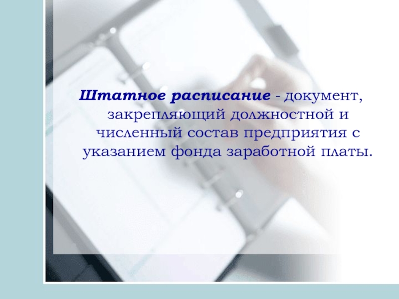 Слайд 9Штатное расписание - документ, закрепляющий должностной и численный состав предприятия с