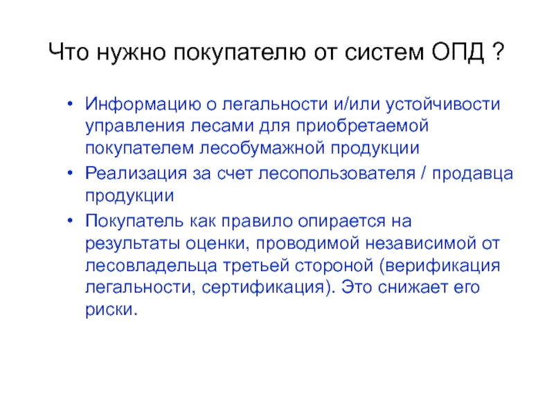 Покупатель как правило опирается на результаты оценки, проводимой независимой от лесовладельца третьей стороной (верификация легальности, сертификация). Это снижает его риски.