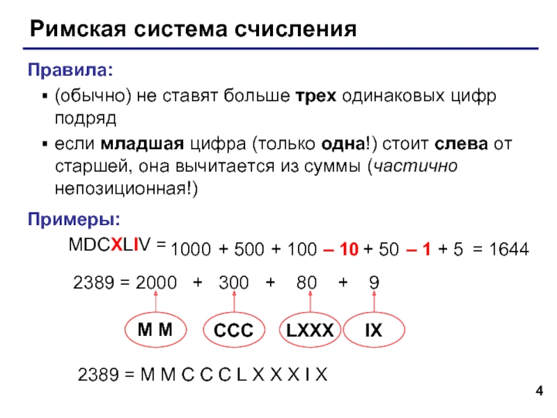 Римская: I – 1 (палец), V – 5 (раскрытая ладонь, 5 пальцев), X – 10 (две ладони), L – 50, C – 100 (Centum), D – 500 (Demimille), M – 1000 (Mille)
