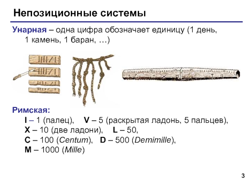непозиционные – значение цифры не зависит от ее места (позиции) в записи числа;