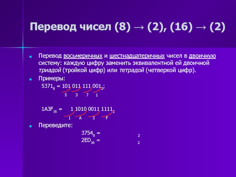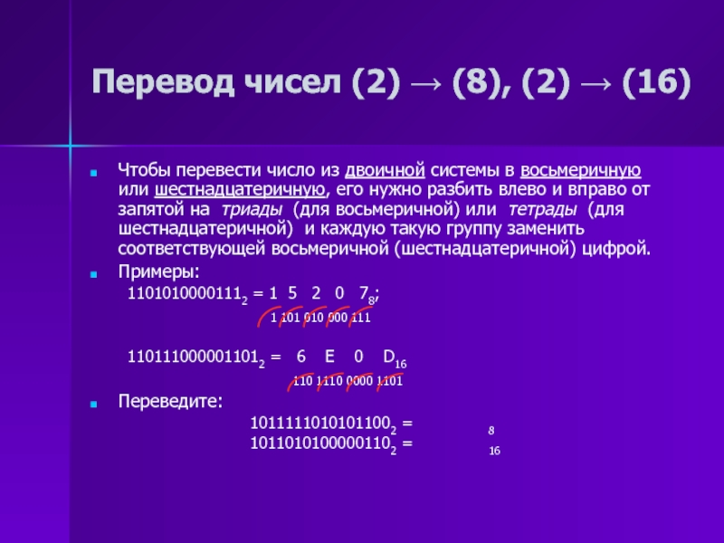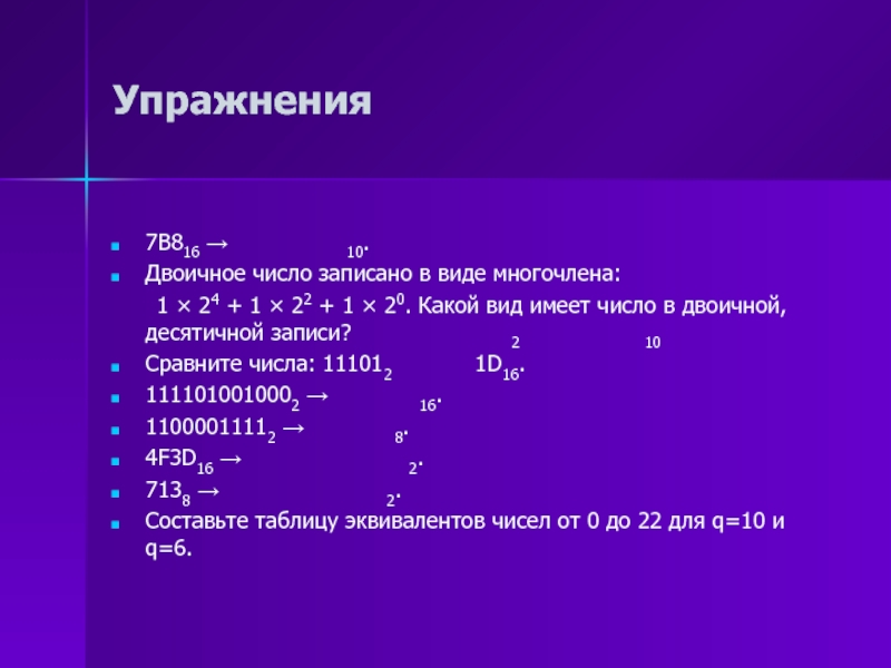 Пример 1. У многих народов использовалась система, алфавит которой состоял из одного символа — палочки. Для изображения какого-то числа в этой системе нужно записать определенное множество палочек, равное данному числу: ||||| — число пять.