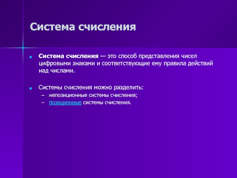 Пример 2. Самой распространенной непозиционной системой счисления является римская. Алфавит римской системы записи чисел состоит из символов: I — один, V — пять, X — десять, L — пятьдесят, C — сто, D — пятьсот, M — тысяча.