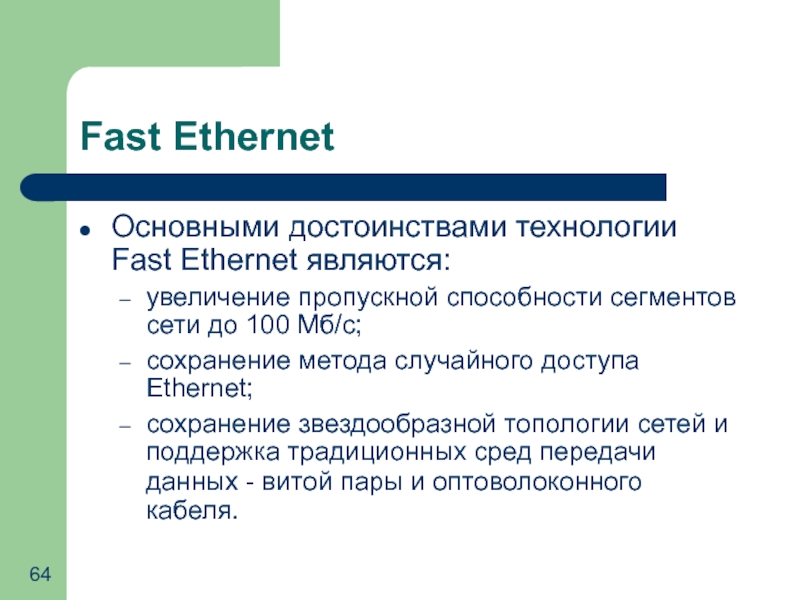 Отличия Fast Ethernet от Ethernet сосредоточены на физическом уровне Более сложная структура физического уровня технологии Fast Ethernet вызвана тем, что в ней используется три варианта кабельных систем - оптоволокно, 2-х парная витая пара категории 5 и 4-х парная витая пара категории 3