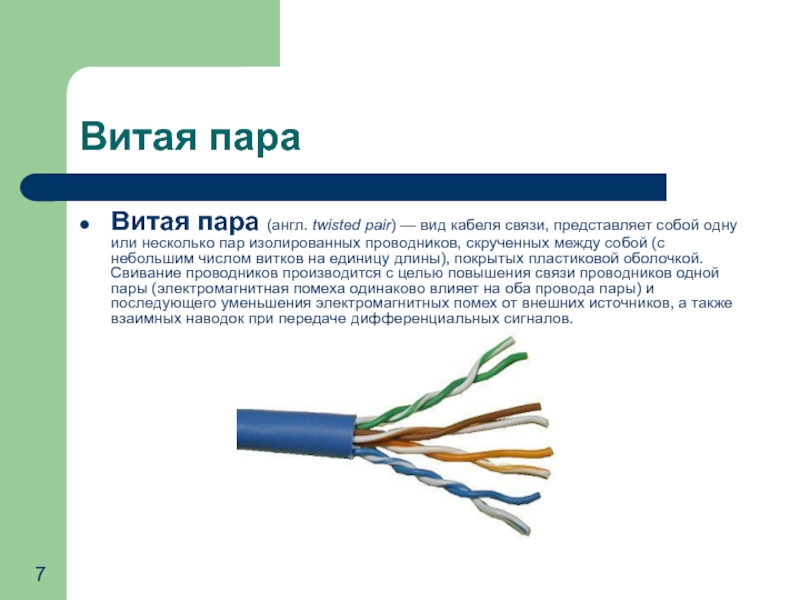 Витая пара (англ. twisted pair) — вид кабеля связи, представляет