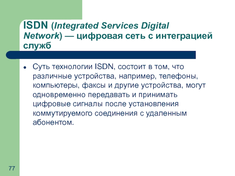 Слайд 77ISDN (Integrated Services Digital Network) — цифровая сеть с интеграцией служб