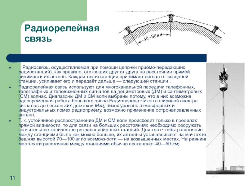 Т. к. устойчивое распространение ДМ и СМ волн происходит только в пределах прямой видимости, то для связи на больших расстояниях необходимо сооружать значительное количество ретрансляционных станций. Для того чтобы расстояние между станциями было как можно больше, их антенны устанавливают на мачтах или башнях высотой 70—100 м по возможности — на возвышенных местах. На равнинной местности расстояние между станциями обычно составляет 40—50 км;