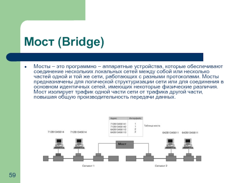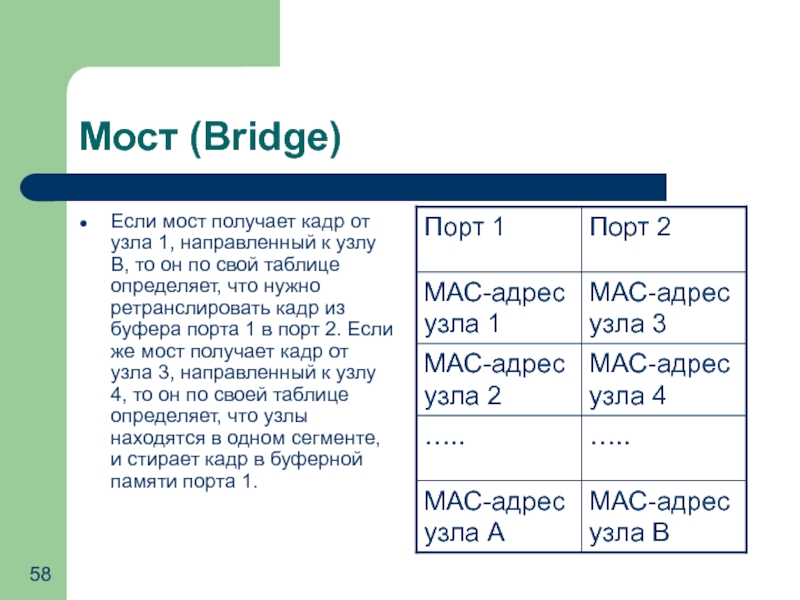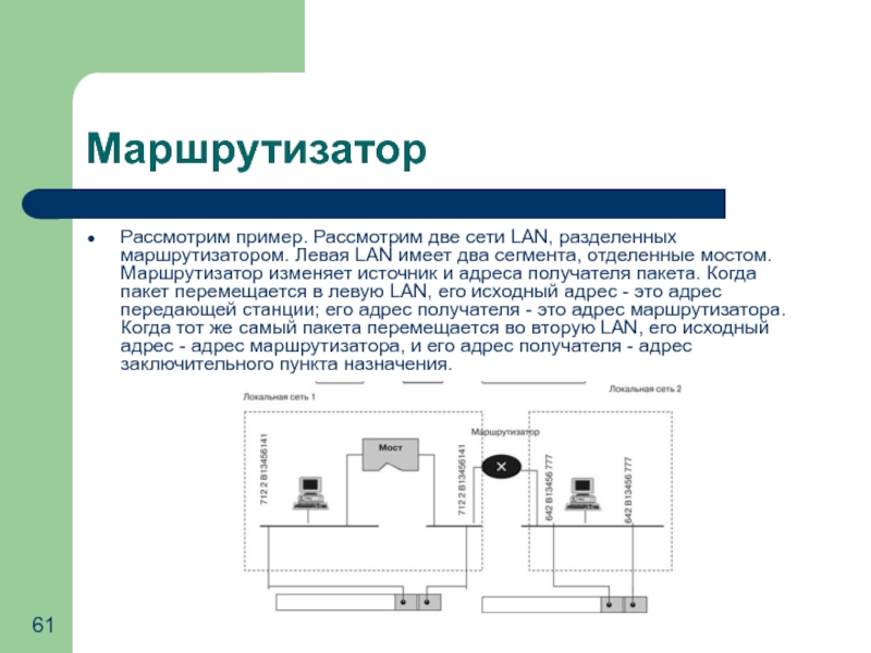 два сегмента, отделенные мостом. Маршрутизатор изменяет источник и адреса получателя пакета. Когда пакет перемещается в левую LAN, его исходный адрес - это адрес передающей станции; его адрес получателя - это адрес маршрутизатора. Когда тот же самый пакета перемещается во вторую LAN, его исходный адрес - адрес маршрутизатора, и его адрес получателя - адрес заключительного пункта назначения.