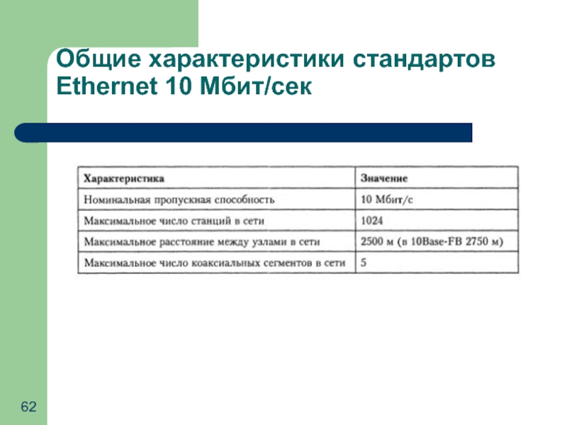 Слайд 62Общие характеристики стандартов Ethernet 10 Мбит/сек