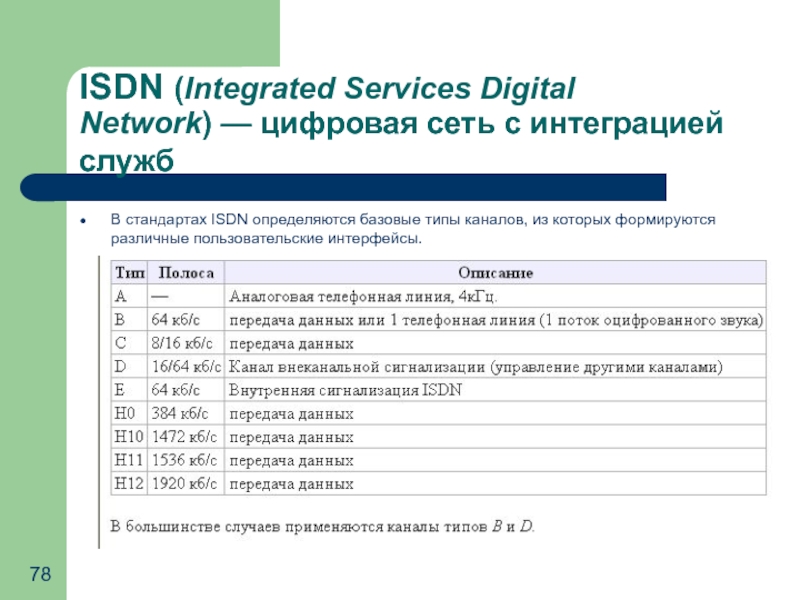 Слайд 78ISDN (Integrated Services Digital Network) — цифровая сеть с интеграцией служб