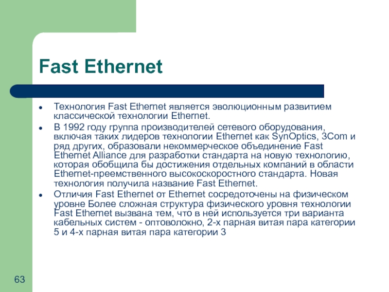 1992 году группа производителей сетевого оборудования, включая таких лидеров технологии Ethernet как SynOptics, 3Com и ряд других, образовали некоммерческое объединение Fast Ethernet Alliance для разработки стандарта на новую технологию, которая обобщила бы достижения отдельных компаний в области Ethernet-преемственного высокоскоростного стандарта. Новая технология получила название Fast Ethernet.