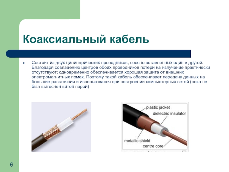 другой. Благодаря совпадению центров обоих проводников потери на излучение практически отсутствуют; одновременно обеспечивается хорошая защита от внешних электромагнитных помех. Поэтому такой кабель обеспечивает передачу данных на большие расстояния и использовался при построении компьютерных сетей (пока не был вытеснен витой парой)