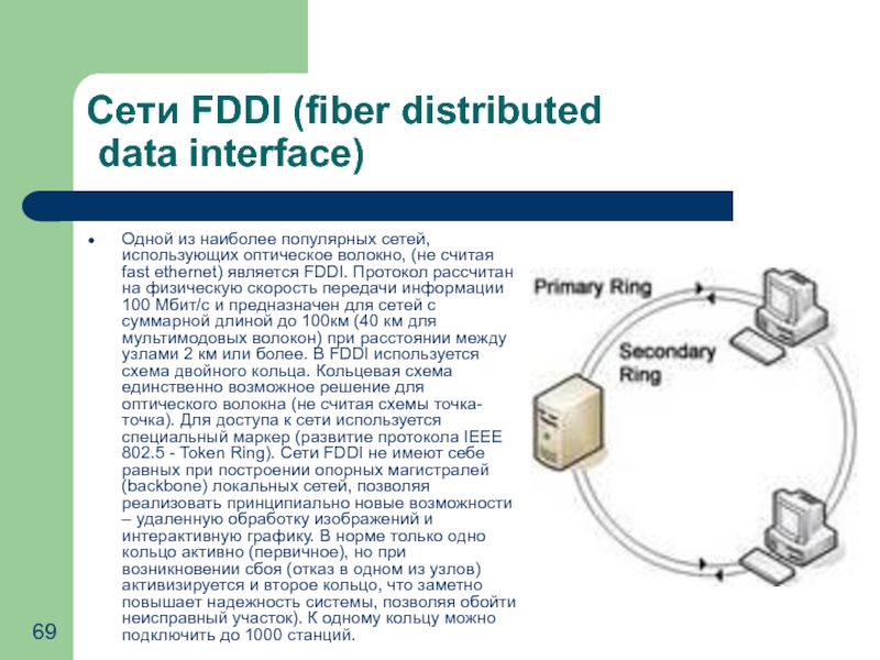 использующих оптическое волокно, (не считая fast ethernet) является FDDI. Протокол рассчитан на физическую скорость передачи информации 100 Мбит/с и предназначен для сетей с суммарной длиной до 100км (40 км для мультимодовых волокон) при расстоянии между узлами 2 км или более. В FDDI используется схема двойного кольца. Кольцевая схема единственно возможное решение для оптического волокна (не считая схемы точка-точка). Для доступа к сети используется специальный маркер (развитие протокола IEEE 802.5 - Token Ring). Сети FDDI не имеют себе равных при построении опорных магистралей (backbone) локальных сетей, позволяя реализовать принципиально новые возможности – удаленную обработку изображений и интерактивную графику. В норме только одно кольцо активно (первичное), но при возникновении сбоя (отказ в одном из узлов) активизируется и второе кольцо, что заметно повышает надежность системы, позволяя обойти неисправный участок). К одному кольцу можно подключить до 1000 станций.