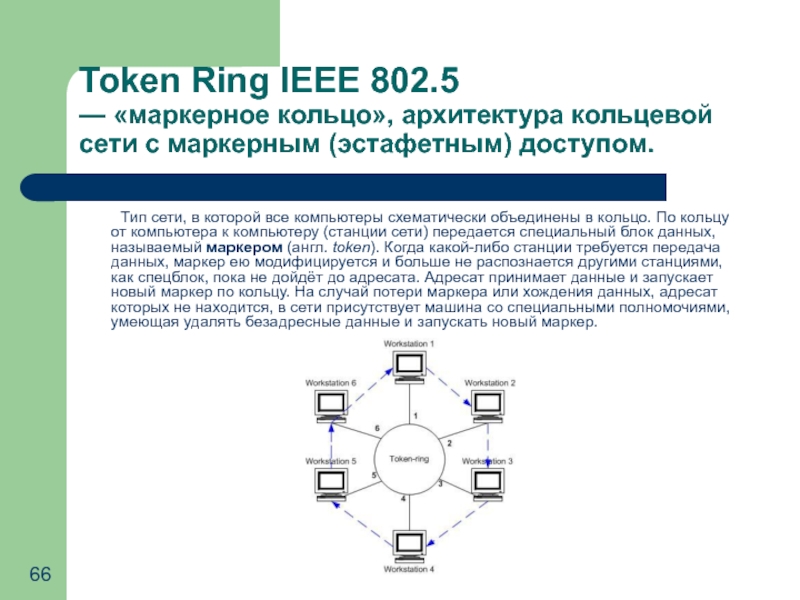 Тип сети, в которой все компьютеры схематически объединены в кольцо. По кольцу от компьютера к компьютеру (станции сети) передается специальный блок данных, называемый маркером (англ. token). Когда какой-либо станции требуется передача данных, маркер ею модифицируется и больше не распознается другими станциями, как спецблок, пока не дойдёт до адресата. Адресат принимает данные и запускает новый маркер по кольцу. На случай потери маркера или хождения данных, адресат которых не находится, в сети присутствует машина со специальными полномочиями, умеющая удалять безадресные данные и запускать новый маркер.
