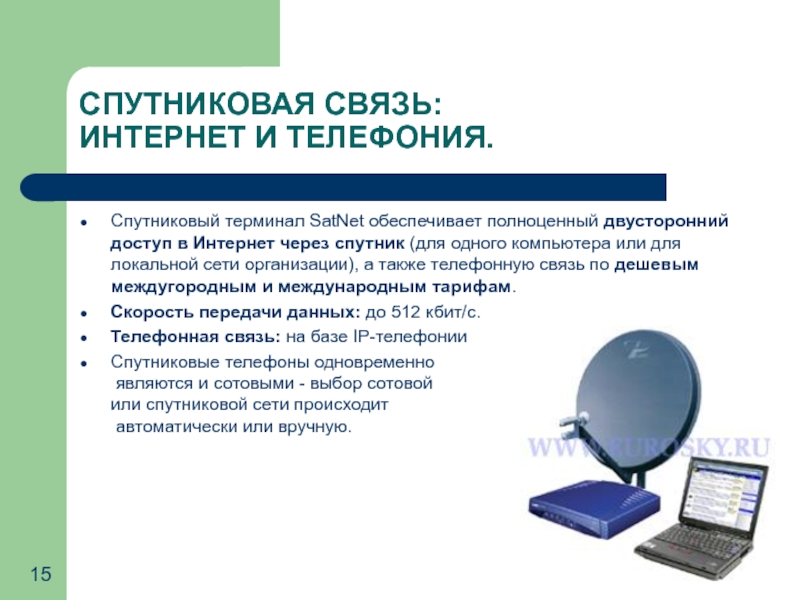 в Интернет через спутник (для одного компьютера или для локальной сети организации), а также телефонную связь по дешевым междугородным и международным тарифам.