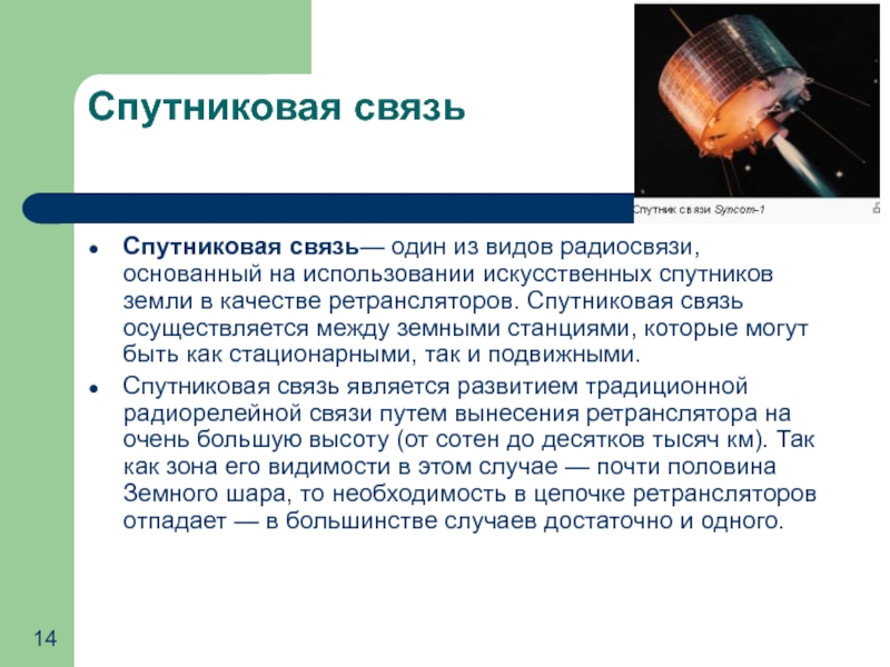 Спутниковая связь— один из видов радиосвязи, основанный на использовании искусственных