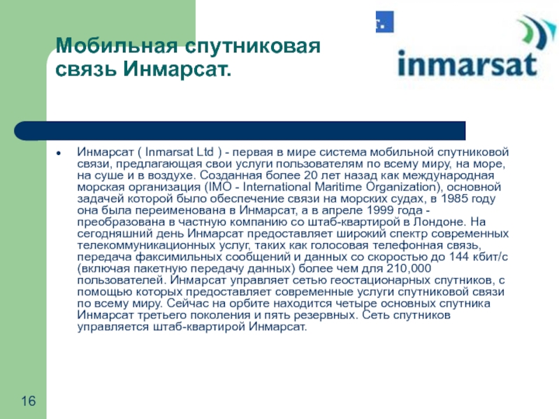 в мире система мобильной спутниковой связи, предлагающая свои услуги пользователям по всему миру, на море, на суше и в воздухе. Созданная более 20 лет назад как международная морская организация (IMO - International Maritime Organization), основной задачей которой было обеспечение связи на морских судах, в 1985 году она была переименована в Инмарсат, а в апреле 1999 года - преобразована в частную компанию со штаб-квартирой в Лондоне. На сегодняшний день Инмарсат предоставляет широкий спектр современных телекоммуникационных услуг, таких как голосовая телефонная связь, передача факсимильных сообщений и данных со скоростью до 144 кбит/с (включая пакетную передачу данных) более чем для 210,000 пользователей. Инмарсат управляет сетью геостационарных спутников, с помощью которых предоставляет современные услуги спутниковой связи по всему миру. Сейчас на орбите находится четыре основных спутника Инмарсат третьего поколения и пять резервных. Сеть спутников управляется штаб-квартирой Инмарсат.