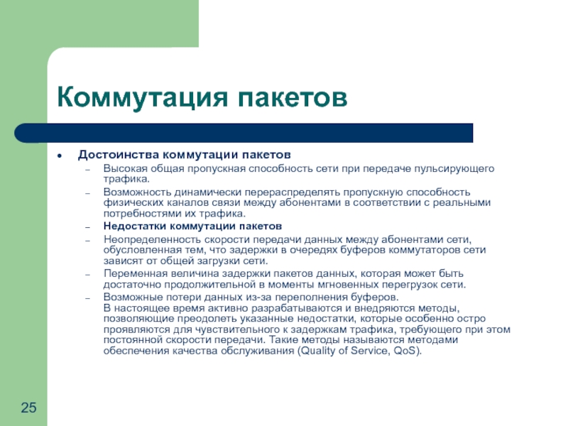 В настоящее время активно разрабатываются и внедряются методы, позволяющие преодолеть указанные недостатки, которые особенно остро проявляются для чувствительного к задержкам трафика, требующего при этом постоянной скорости передачи. Такие методы называются методами обеспечения качества обслуживания (Quality of Service, QoS).