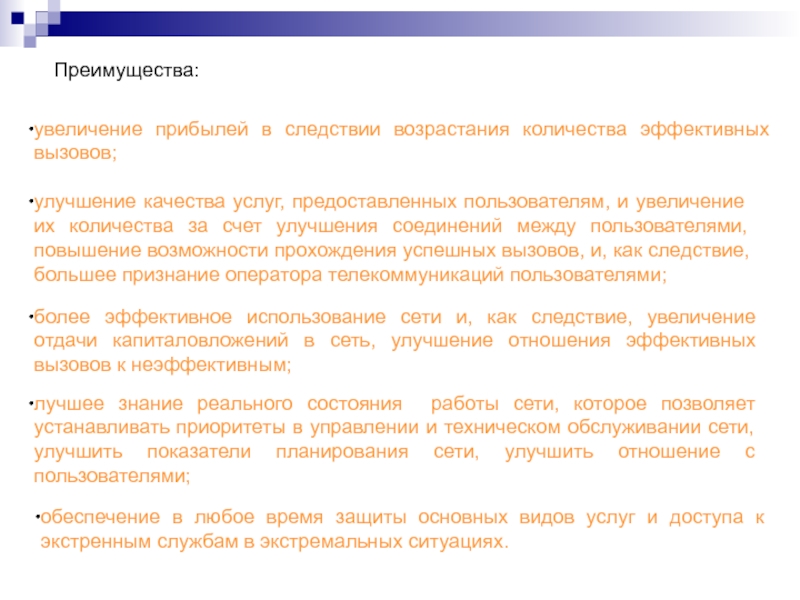 более эффективное использование сети и, как следствие, увеличение отдачи капиталовложений в сеть, улучшение отношения эффективных вызовов к неэффективным;