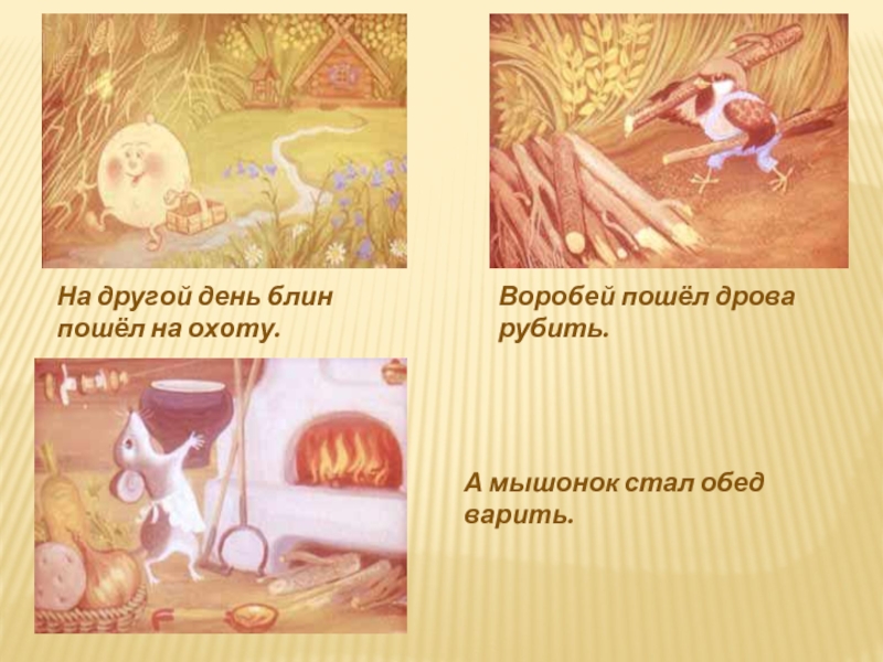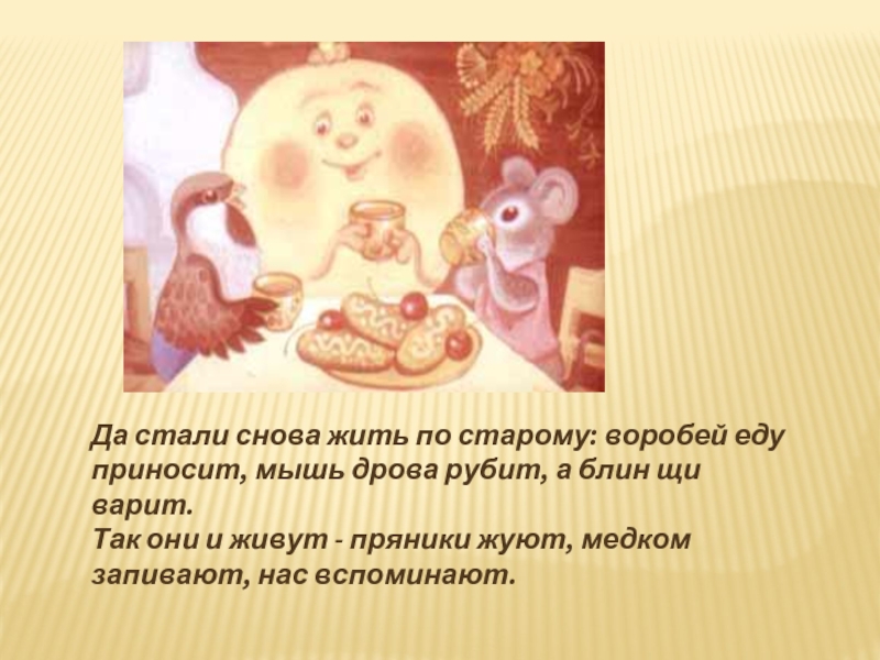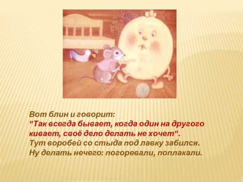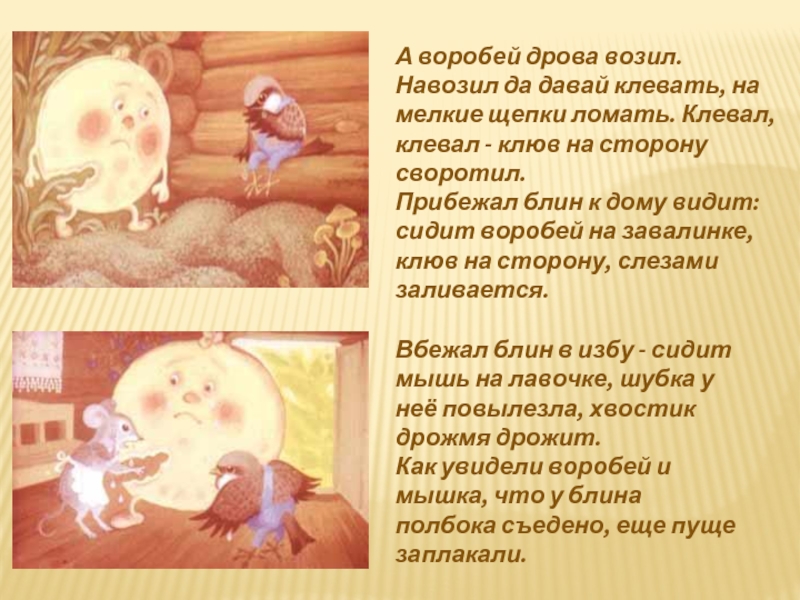 Как увидели воробей и мышка, что у блина полбока съедено, еще пуще заплакали.