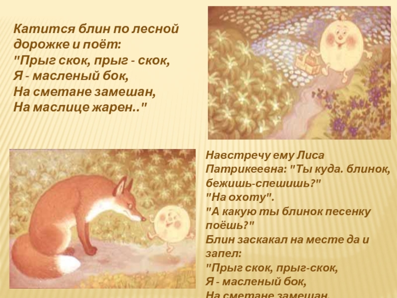Навстречу ему Лиса Патрикеевна: "Ты куда. блинок, бежишь-спешишь?"