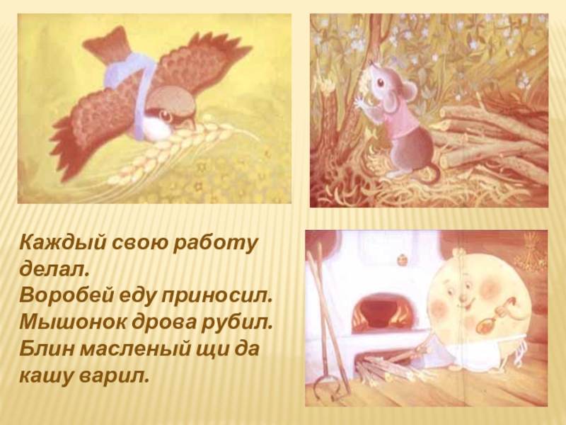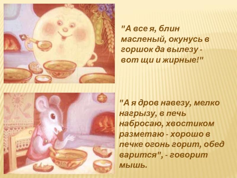 "А я дров навезу, мелко нагрызу, в печь набросаю, хвостиком разметаю - хорошо в печке огонь горит, обед варится", - говорит мышь.