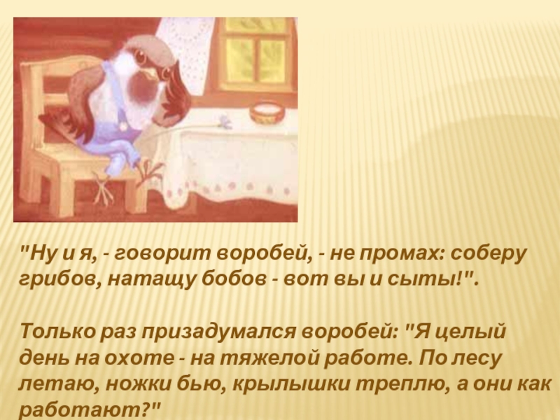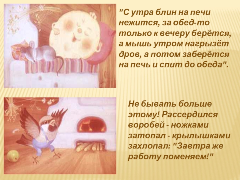 Не бывать больше этому! Рассердился воробей - ножками затопал - крылышками захлопал: "Завтра же работу поменяем!"
