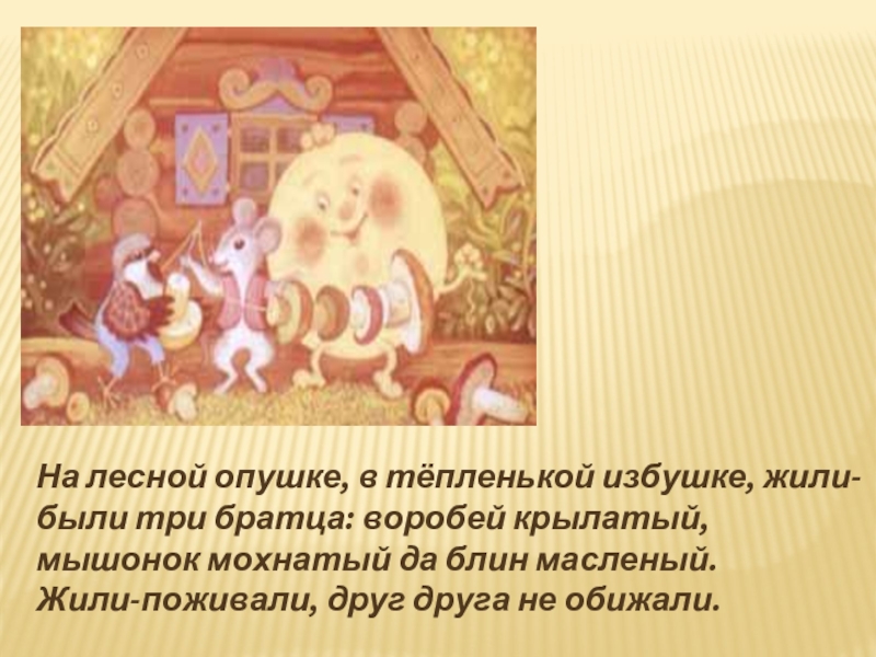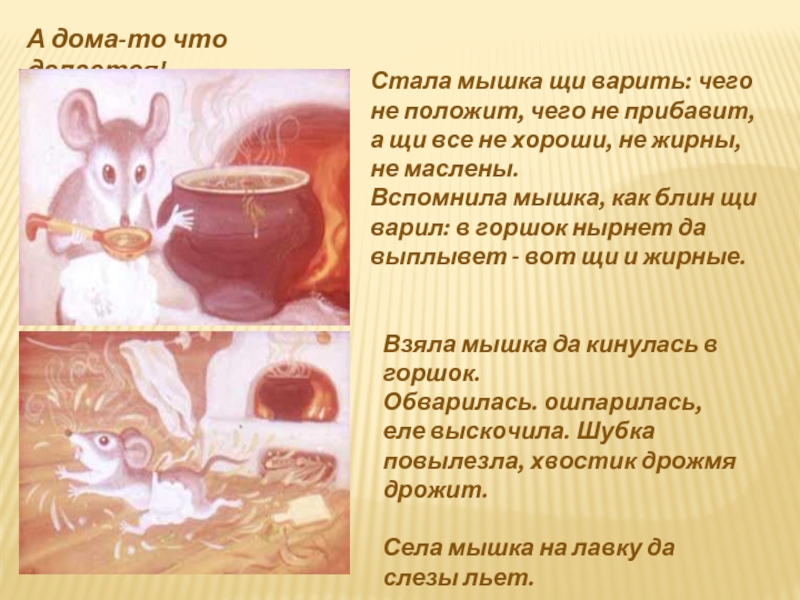 Вбежал блин в избу - сидит мышь на лавочке, шубка у неё повылезла, хвостик дрожмя дрожит.