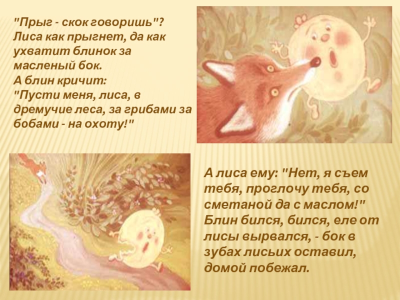 А лиса ему: "Нет, я съем тебя, проглочу тебя, со сметаной да с маслом!"