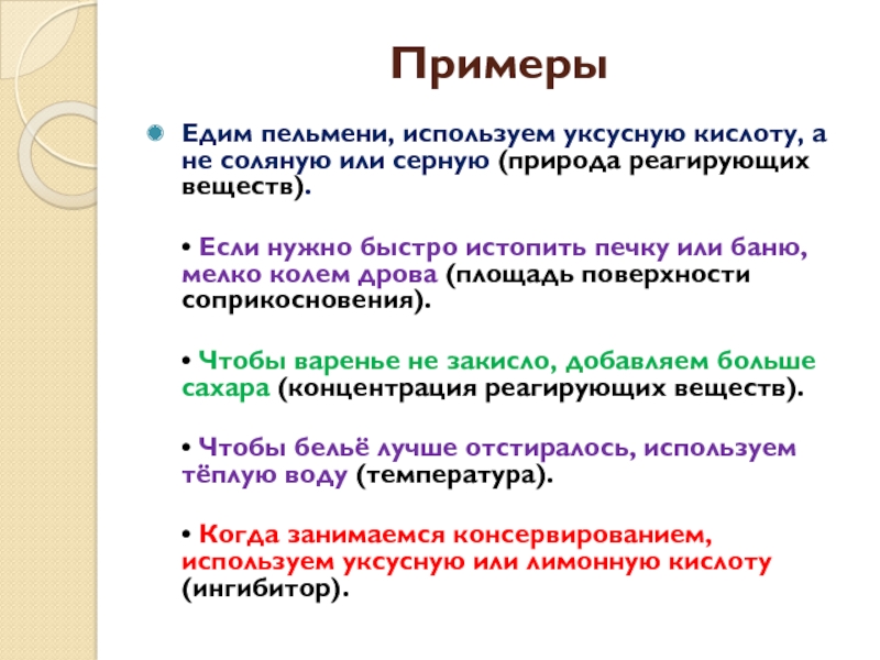 • Чтобы варенье не закисло, добавляем больше сахара (концентрация реагирующих веществ).