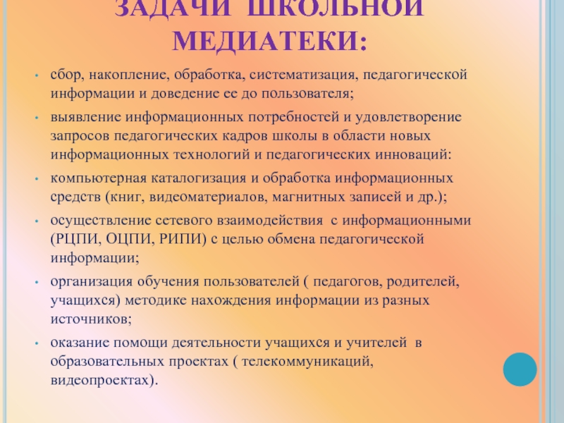 ЗАДАЧИ ШКОЛЬНОЙ МЕДИАТЕКИ: