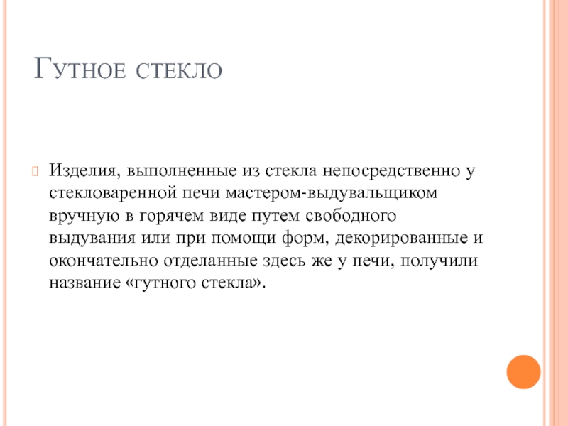 в горячем виде путем свободного выдувания или при помощи форм, декорированные и окончательно отделанные здесь же у печи, получили название «гутного стекла».
