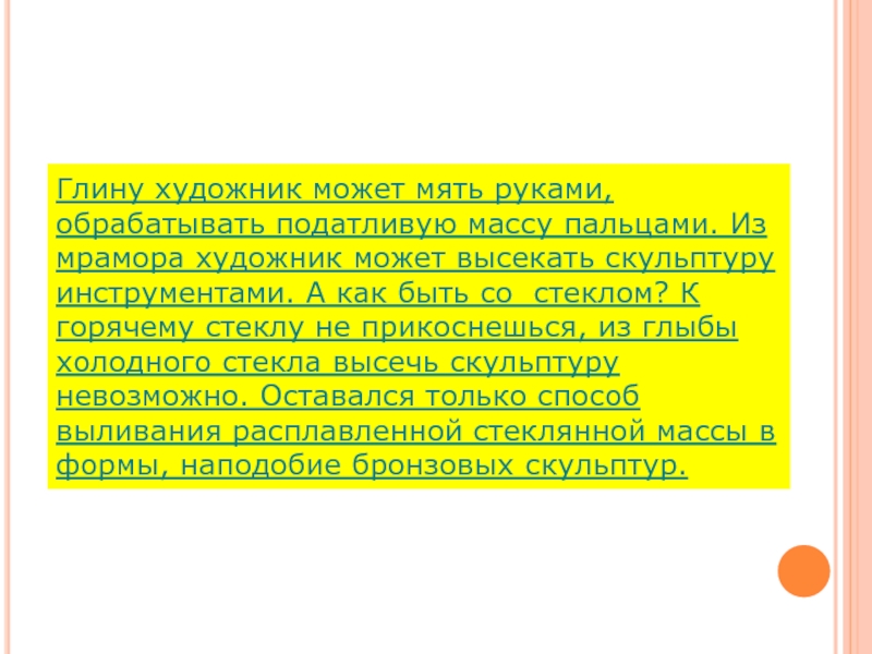 художник может высекать скульптуру инструментами. А как быть со стеклом? К горячему стеклу не прикоснешься, из глыбы холодного стекла высечь скульптуру невозможно. Оставался только способ выливания расплавленной стеклянной массы в формы, наподобие бронзовых скульптур.