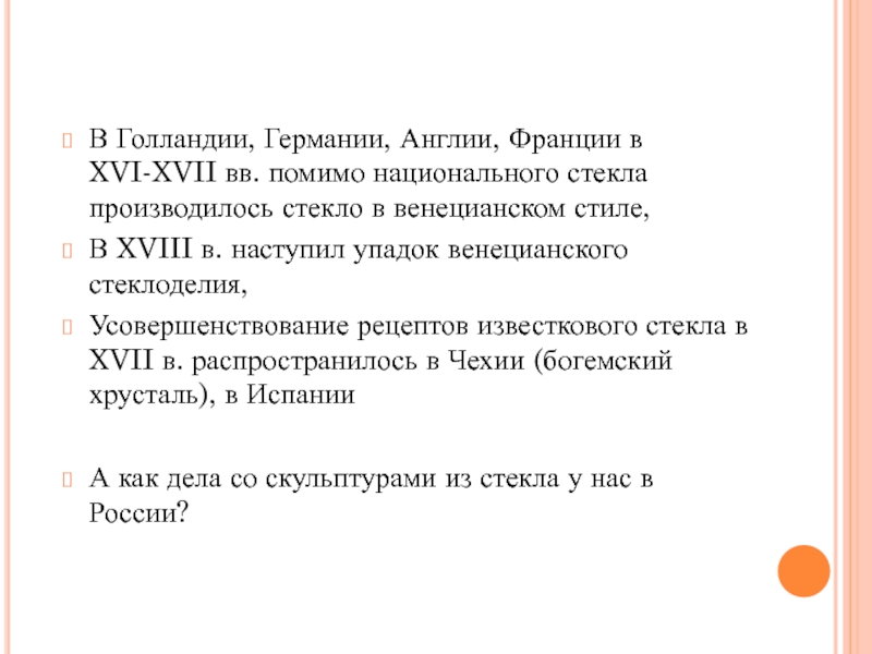 В Голландии, Германии, Англии, Франции в XVI-XVII вв. помимо национального стекла