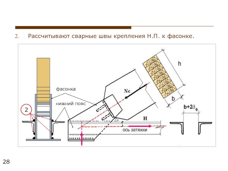 Слайд 48Узел крепления сжатой стойки к верхнему поясу.