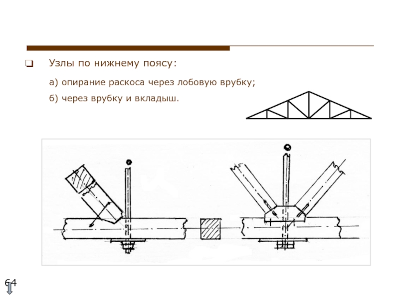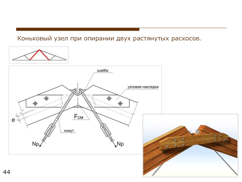 Слайд 44Коньковый узел при опирании двух растянутых раскосов.