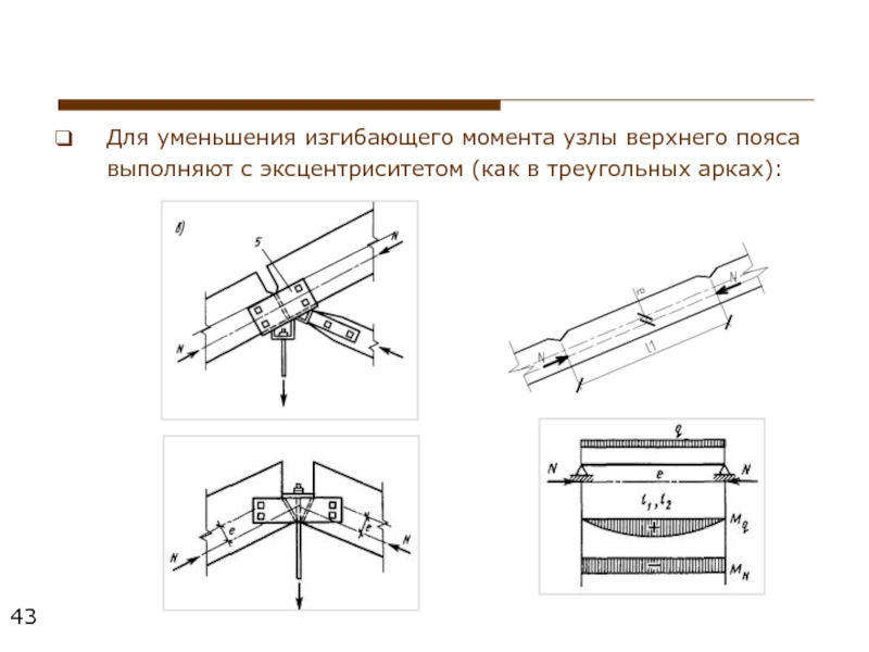 Слайд 43Для уменьшения изгибающего момента узлы верхнего пояса выполняют с эксцентриситетом (как