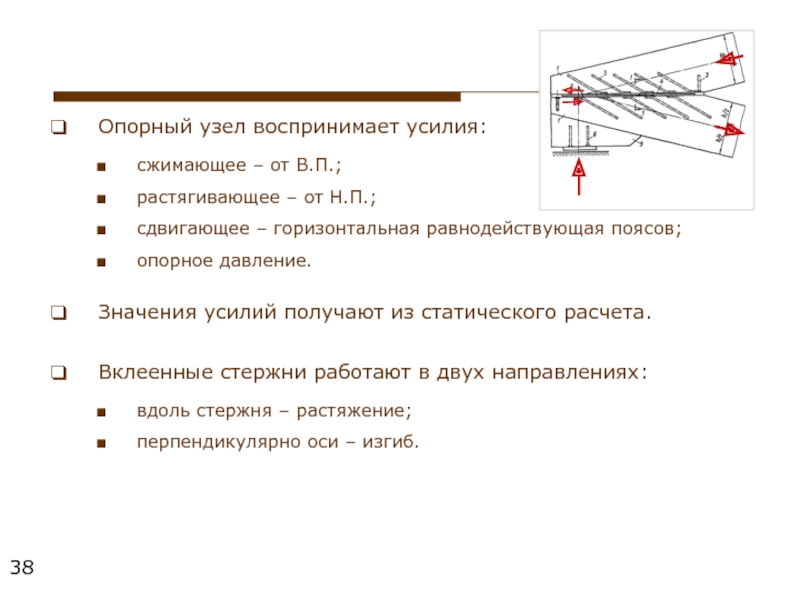 Слайд 63Опорный узел с лобовым упором на тяжах выдерживает N до 30