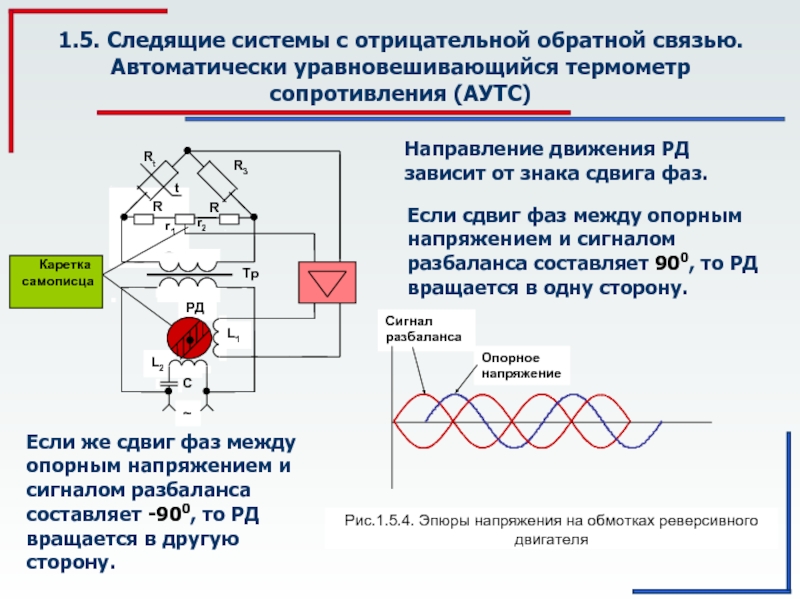 Если же сдвиг фаз между опорным напряжением и сигналом разбаланса составляет -900, то РД вращается в другую сторону.