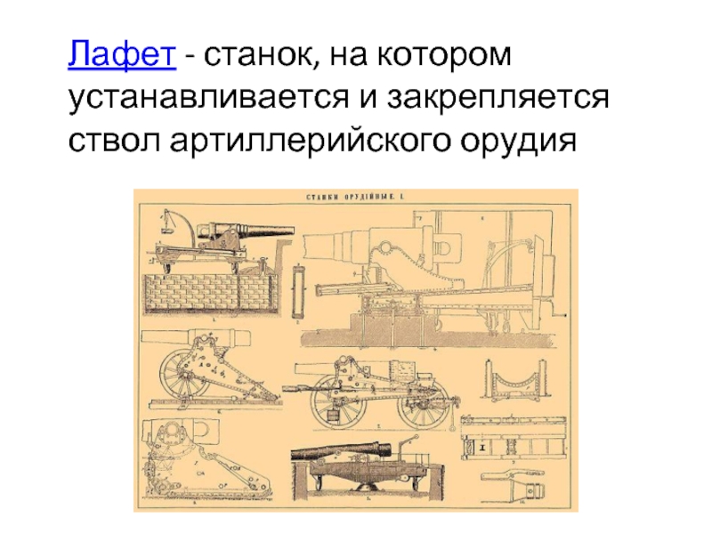 Слайд 4Лафет - станок, на котором устанавливается и закрепляется ствол артиллерийского орудия