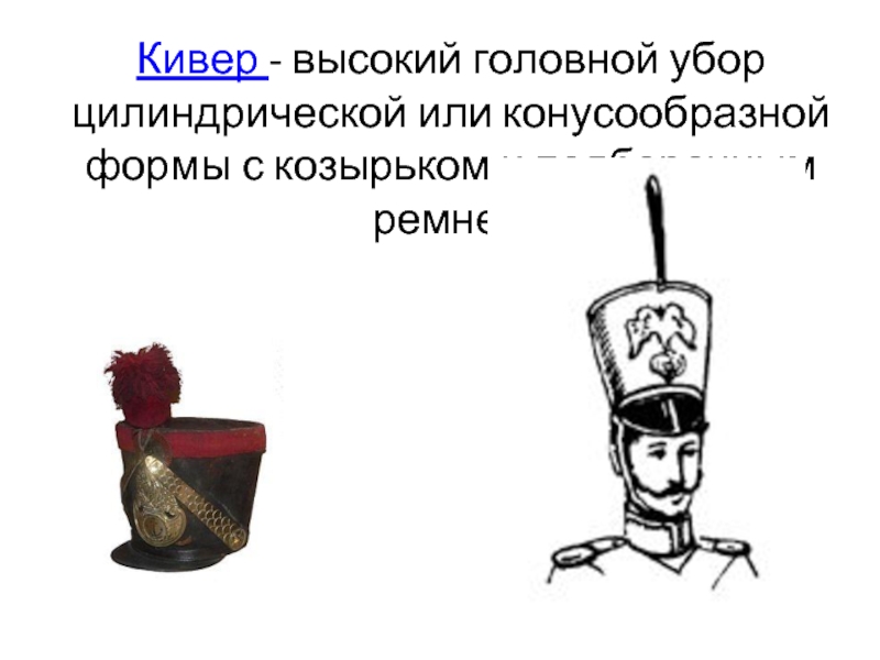 Слайд 6Кивер - высокий головной убор цилиндрической или конусообразной формы с козырьком