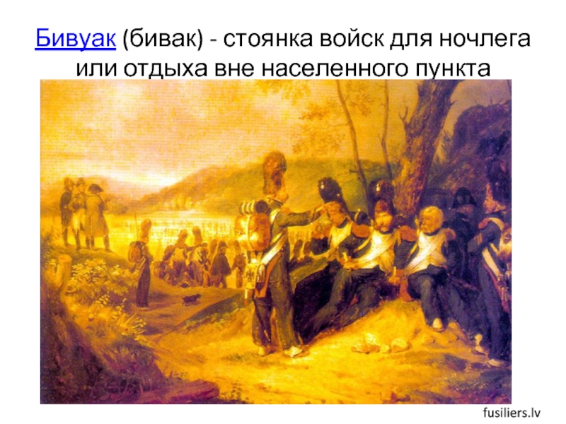 Слайд 5Бивуак (бивак) - стоянка войск для ночлега или отдыха вне населенного