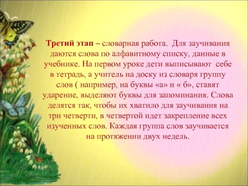Слайд 10Третий этап – словарная работа. Для заучивания даются слова по алфавитному