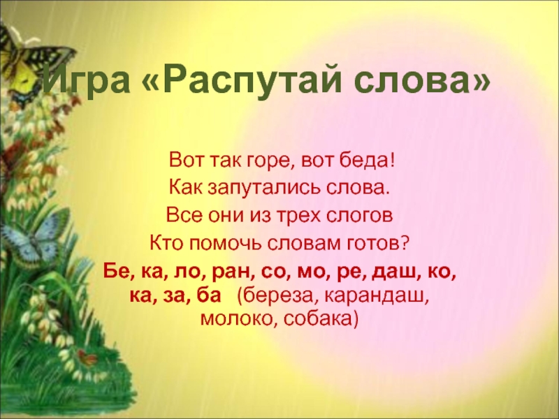 Бе, ка, ло, ран, со, мо, ре, даш, ко, ка, за, ба (береза, карандаш, молоко, собака)