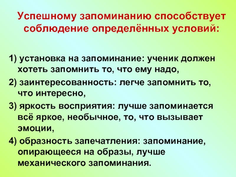 Слайд 3Успешному запоминанию способствует соблюдение определённых условий: