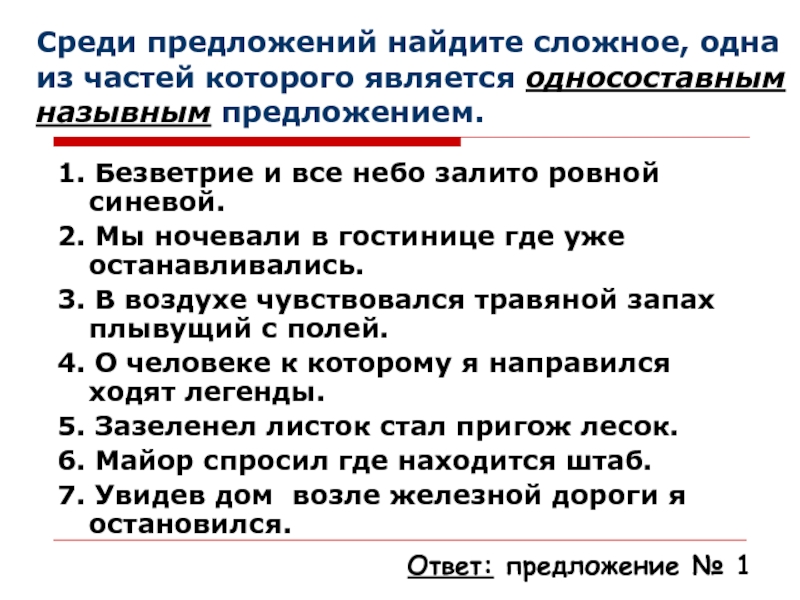 Среди предложений найдите сложное, одна из частей которого является односоставным назывным предложением.