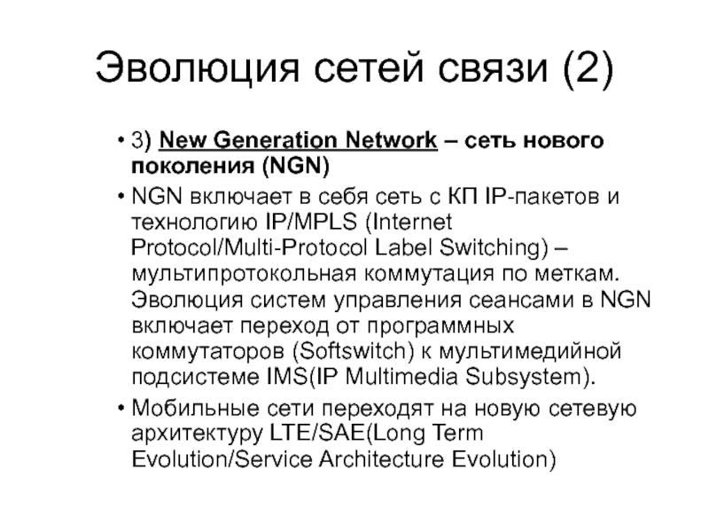 NGN включает в себя сеть с КП IP-пакетов и технологию IP/MPLS (Internet Protocol/Multi-Protocol Label Switching) – мультипротокольная коммутация по меткам. Эволюция систем управления сеансами в NGN включает переход от программных коммутаторов (Softswitch) к мультимедийной подсистеме IMS(IP Multimedia Subsystem).