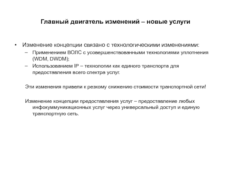 Изменение концепции предоставления услуг – предоставление любых инфокуммуникационных услуг через универсальный доступ и единую транспортную сеть.
