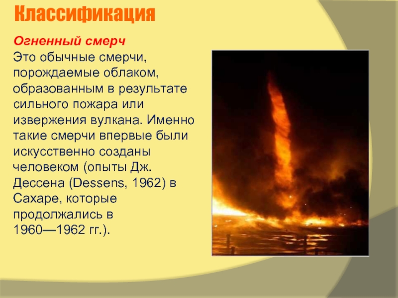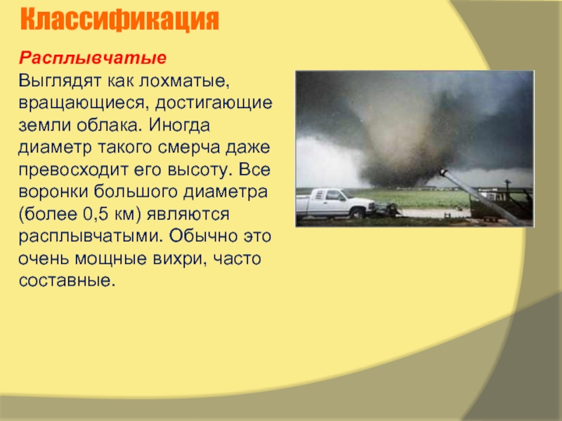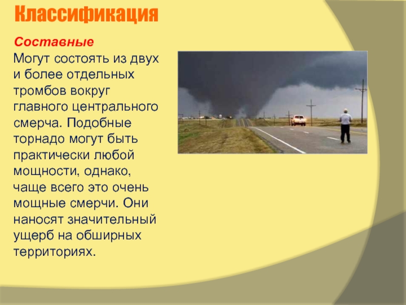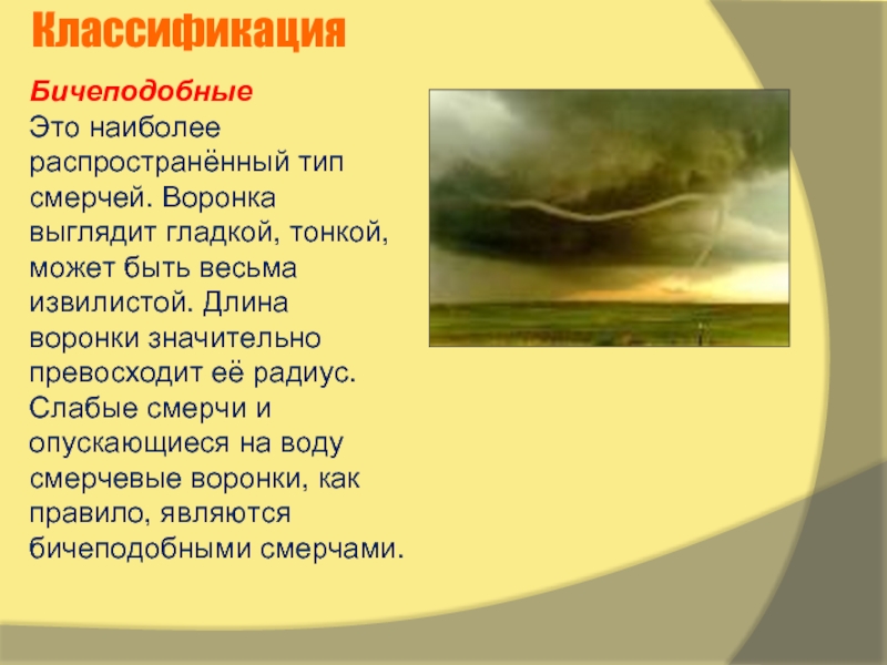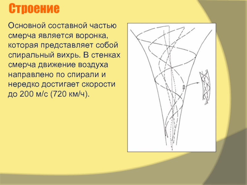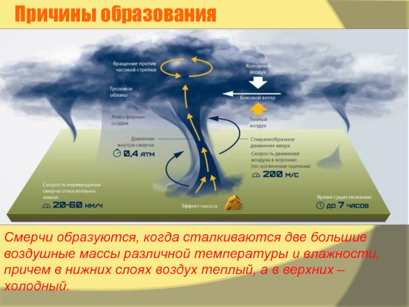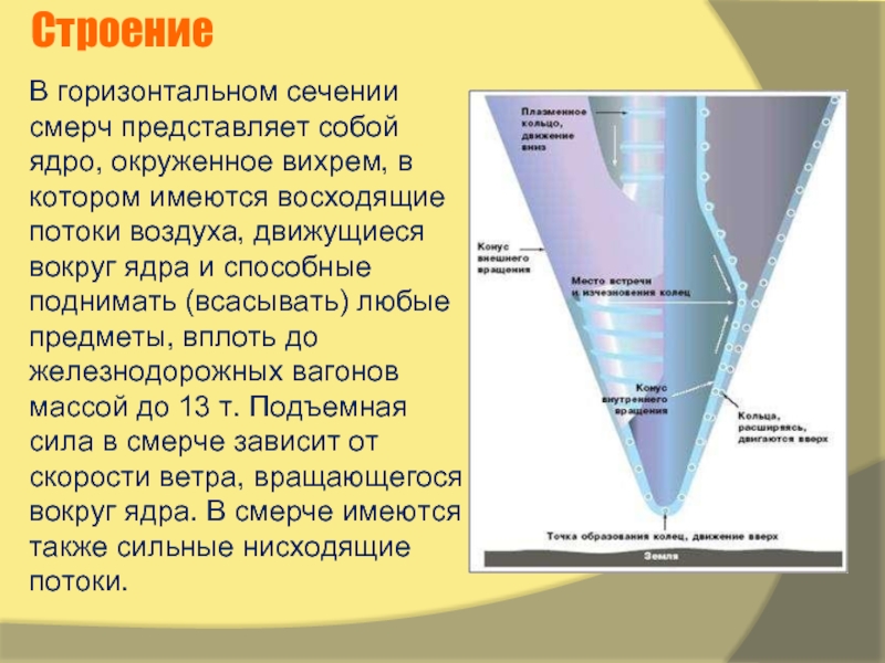 Иными словами, смерч представляет собой сильный вихрь в виде воронки, спускающейся от нижней границы облаков. Этот вихрь иногда называют тромбом (при условии, что он проносится над сушей), а в Северной Америке его называют торнадо.